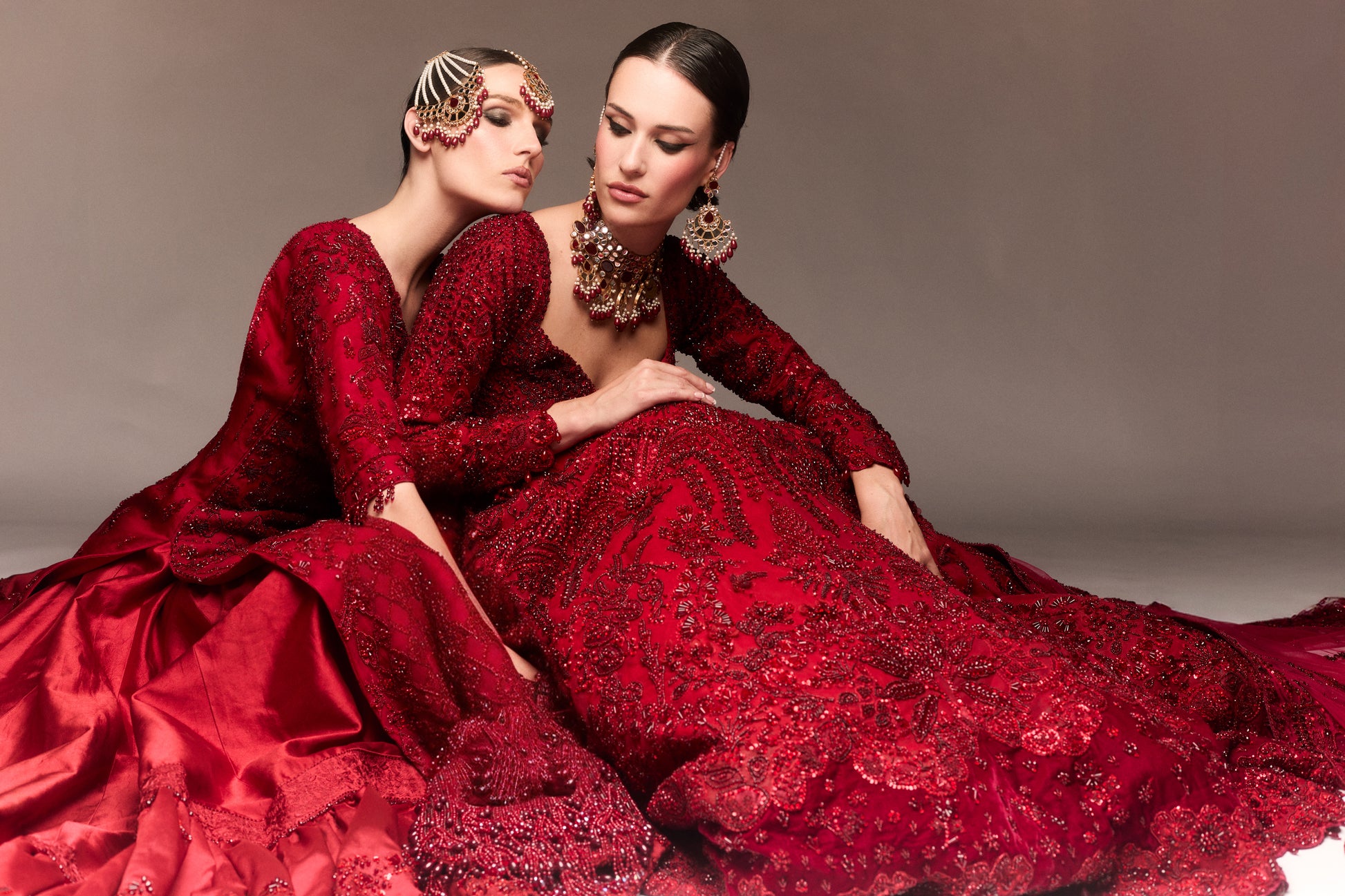 Crimson Veil shimmered with the fire of untold stories. The A-line kameez hugged her with the grace of a promise, its deep neckline leading the eye into a constellation of hand-embellishments—dabka, tilla, cut dana, and Swarovski crystals dancing like fireflies on a midsummer night. Every thread held a secret. Every sequin, a sigh. It was a tapestry of light and longing stitched onto silk that seemed spun from dusk itself.