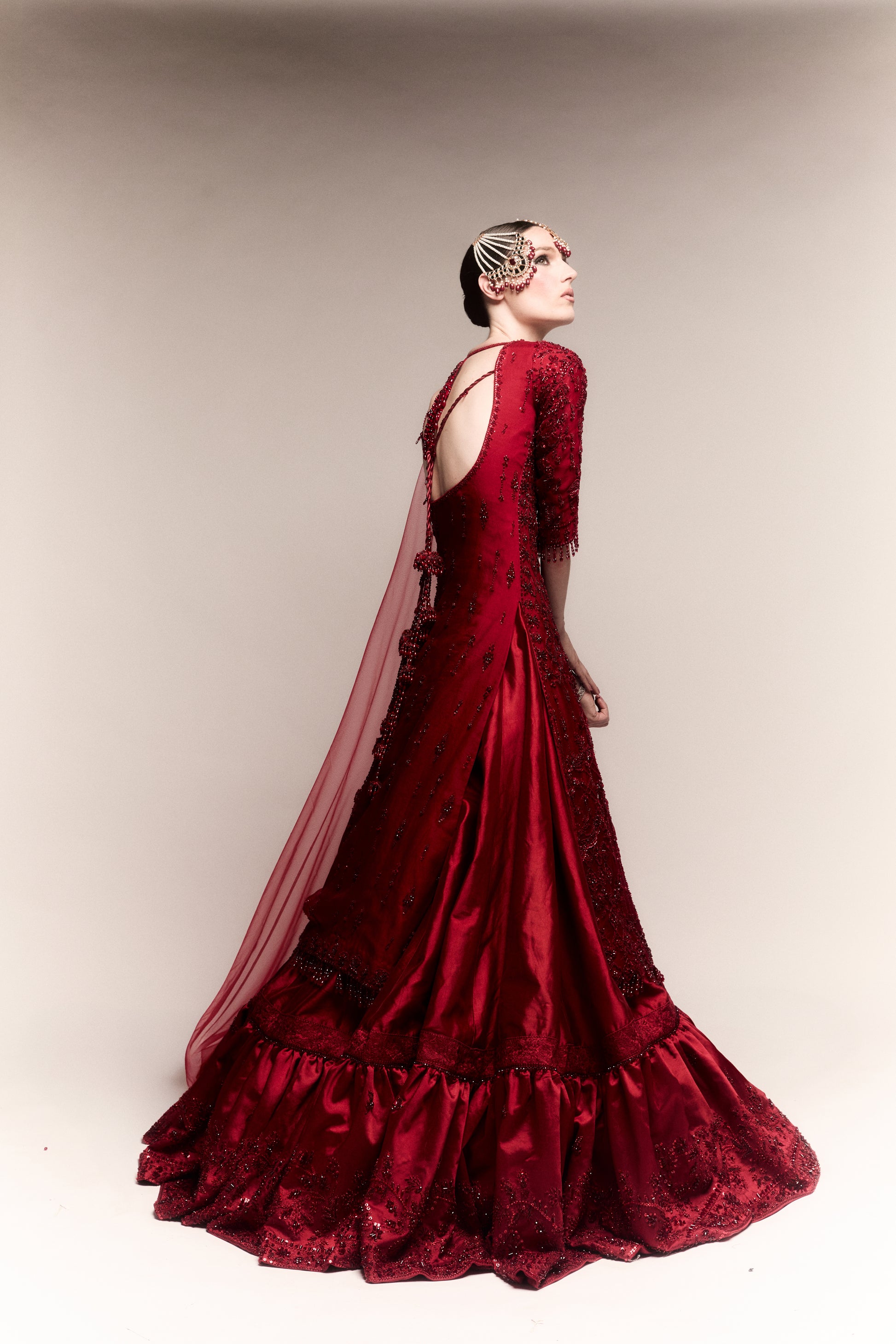 And the veil—oh, the veil. It cascaded behind her like a river of blood-red roses, each fold heavy with meaning. Draped with the elegance of an ancient ritual and the boldness of modern fire, it whispered the strength of generations past and fluttered with the heartbeat of a new beginning. It was not merely worn—it was borne, like a crown of devotion.