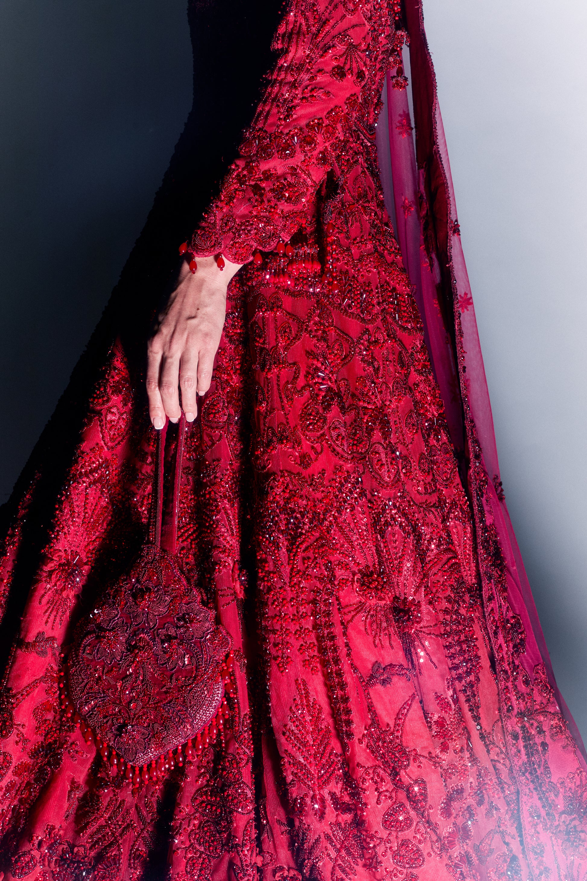 Its beautiful A-line silhouette gracefully flows to the floor, flattering every figure. The gowns border has velvet patch work with intricate hand embriodery blending the joining, with a thick hand embellished border flowing two the floor. The bodice features exquisite beaded embroidery in vibrant red wine and rich red rose, with shimmering beads creating a mesmerizing interplay of color.